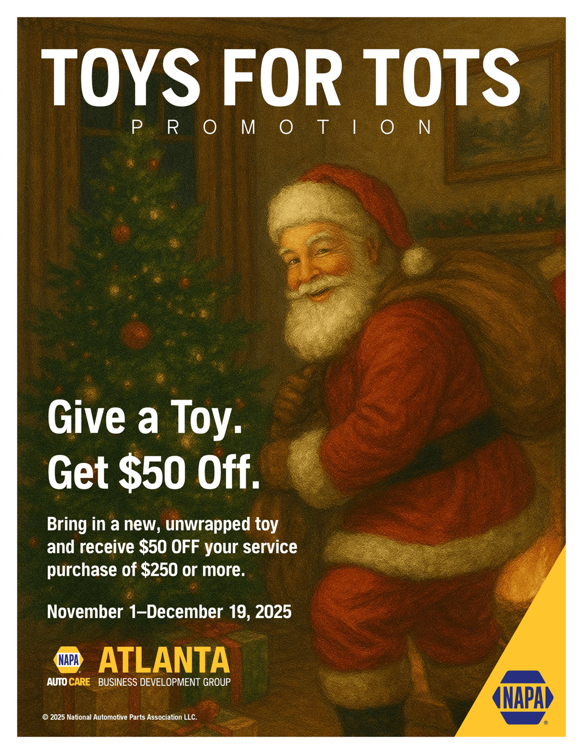 - The program is open to all eligible Atlanta Auto Care BDG Members who opted to participate. The program runs from 11/1/25 – 12/19/25. All participating members have been enrolled as a donation center on the Toys For Tots website.